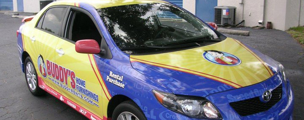 Now That’s A Wrap/Road Signs Inc. was responsible for making sure each vehicle wrap measured up to Buddy’s Home Furnishings high standards of quality. As part of the rebranding, Now That’s A Wrap/Road Signs Inc. was faced with numerous hurdles in order to make the process a smooth one. Initially, Now That’s A Wrap/Road Signs Inc. measured and took pictures of each vehicle. Both Now That’s A Wrap/Road Signs Inc. and the Buddy’s maintenance department made an assessment on each vehicle to make sure they were in adequate condition to be wrapped. Once it was determined which vehicles would be wrapped first, Now That’s A Wrap/Road Signs Inc. began the process of removing the old cut vinyl lettering and stripping the vehicle of any residue the previous vinyl may have left. As part of the process, Now That’s A Wrap/Road Signs Inc. also removed any oxidation from the vehicles prior to installation.
