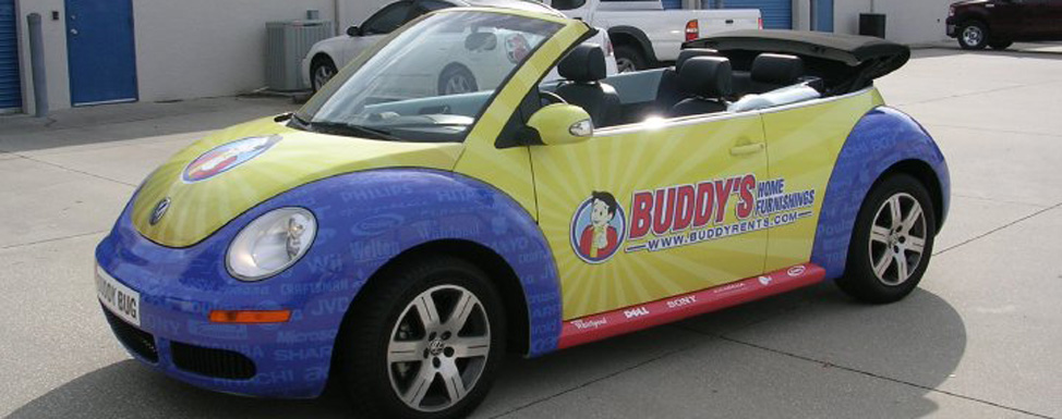 Since Now That’s A Wrap/Road Signs Inc. first began installing Buddy’s delivery and marketing vehicles, Buddy’s has also incorporated other vehicles into their advertising budget. Vehicles Now That’s A Wrap/Road Signs Inc. has wrapped for Buddy’s include buses, VW Bugs, trailers, show stages, race cars, trucks, vans, box trucks and more.